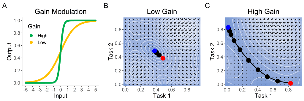 Figure 1. (A) Effect of gain modulation on the nonlinear activation function of task units, which relates the net input of a unit to its activity state. (B-C) Phase portraits for activity of the task units in response to task cues, under low gain (B) and high gain (C), showing trajectory from prior activation of one task (e.g., red dot for task 1) to the cued task (e.g., blue for task 2). Contour lines and arrows indicate the energy and shape of the attractor landscape after a task switch from one task to the other.